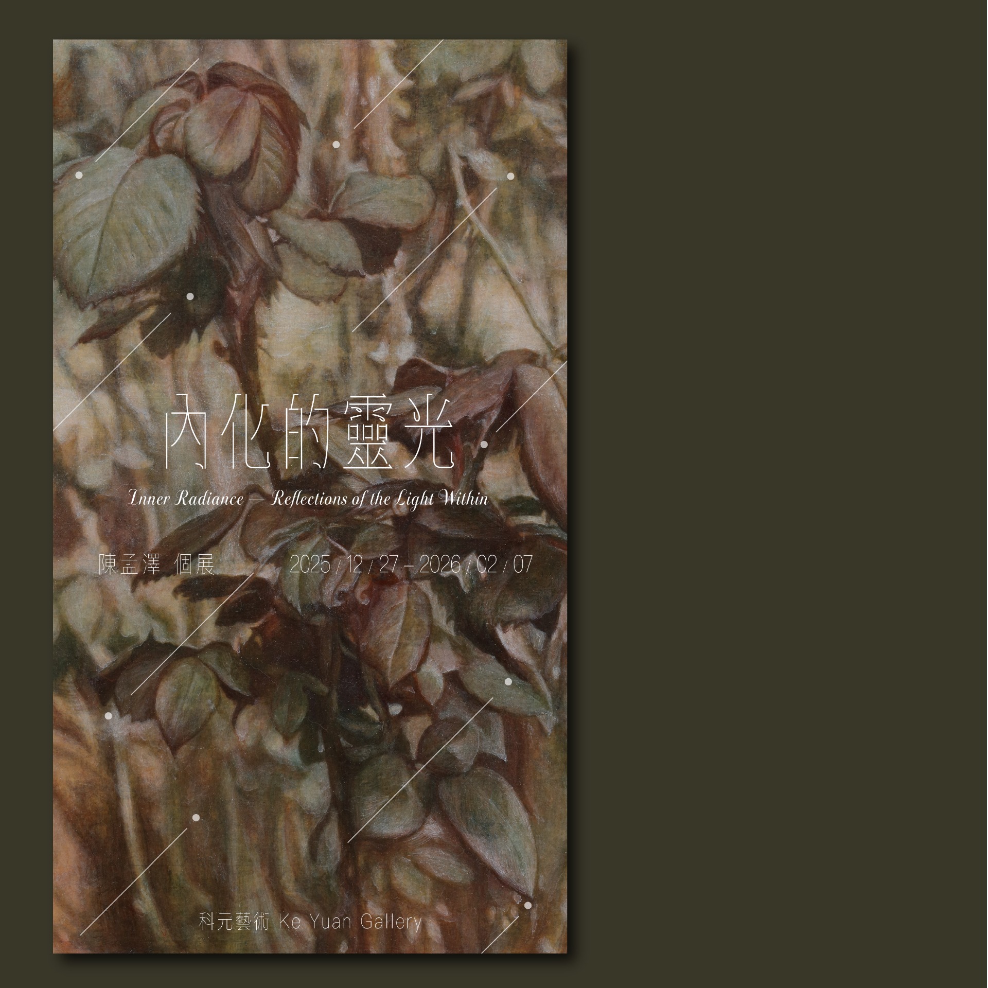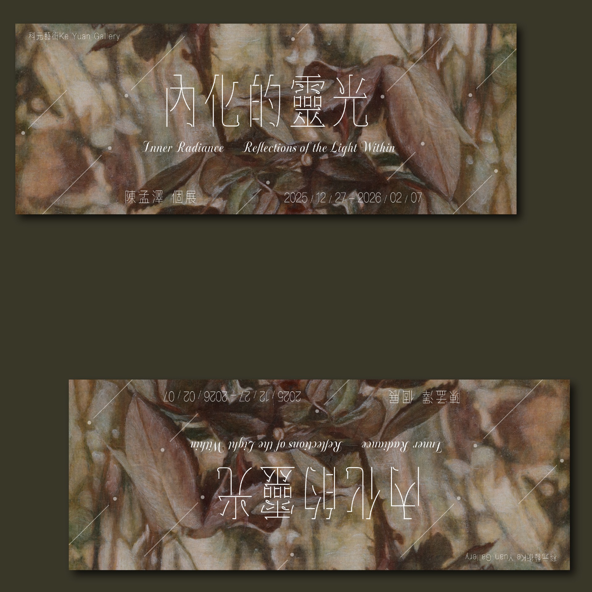 年末了,最近感覺像是在清點今年陸續完成的設計。今年過得很不錯,跟很多藝術家、機構合作,感激大家的信任。最近會持續把設計發完,不知道為什麼把設計整理在臉書,整理得比自己的設計網站還勤奮,像是固定要做的打卡一樣,其實也是希望大家知道我有在做設計,請大家多多來找我。今天要整理的是陳孟澤老師的個展,這張《葉》的色彩特別吸引我。不知是否為蛋彩之故,作品看來寫實,卻好像蒙上一層底片濾鏡,帶來虛幻感受;似乎是有點羅曼蒂克(好老成的形容詞)經過我每天滑手機的考察,通常這類型的作品,大多喜愛配上明體或是宋體,給人一種成熟的感覺。但我挺反骨,我試著讓主標題的字體設計,源自於黑體的變形,達到區分作品的識別度效果。展覽名為「內化的靈光」是我的靈感來源。「靈光」如流星一般地穿梭在藝術家的思想中,鋪在背景上,希望整體看起來會有年輕一點、擴展寫實作品受眾的效果。
