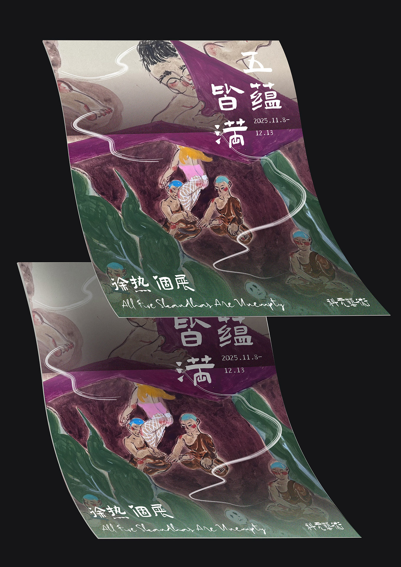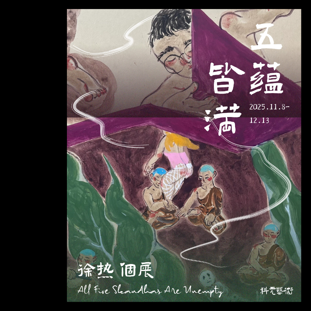 徐熱的藝術實踐是南傳佛教信仰與東方水墨語境的交會點。有別於傳統「佛畫」的單純敘事,他融合泰國壁畫底蘊、台灣學院養成,與自身的佛學體認,將「五蘊皆滿」化為對佛教核心哲學──「五蘊皆空」的積極反思與入世轉譯。這將佛法中追求超脫的「空」,轉化為對現世生命飽和、豐沛狀態的積極承載與描繪,亦是藝術家對身體、情感、思考、行動、意識(五蘊)的全面投入。