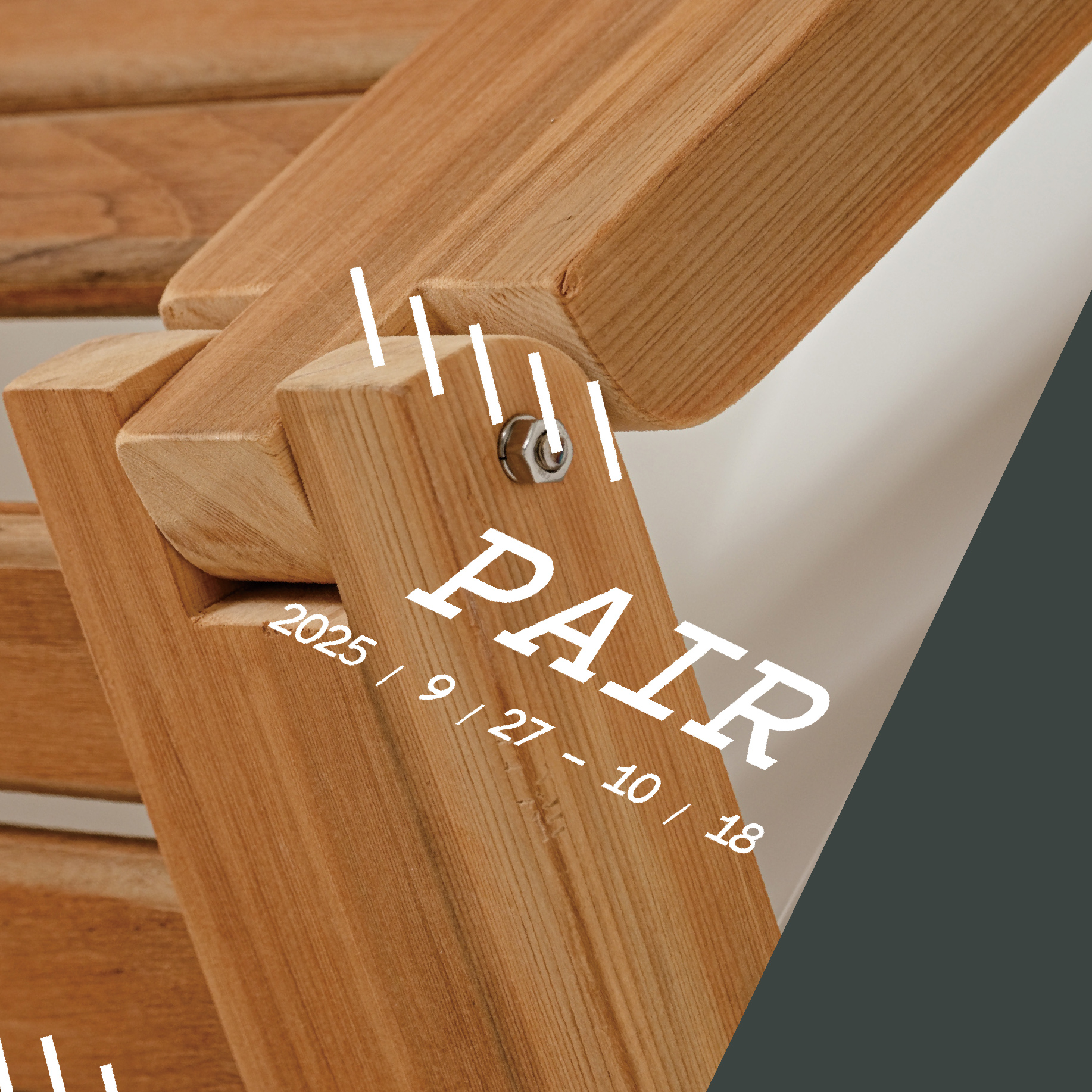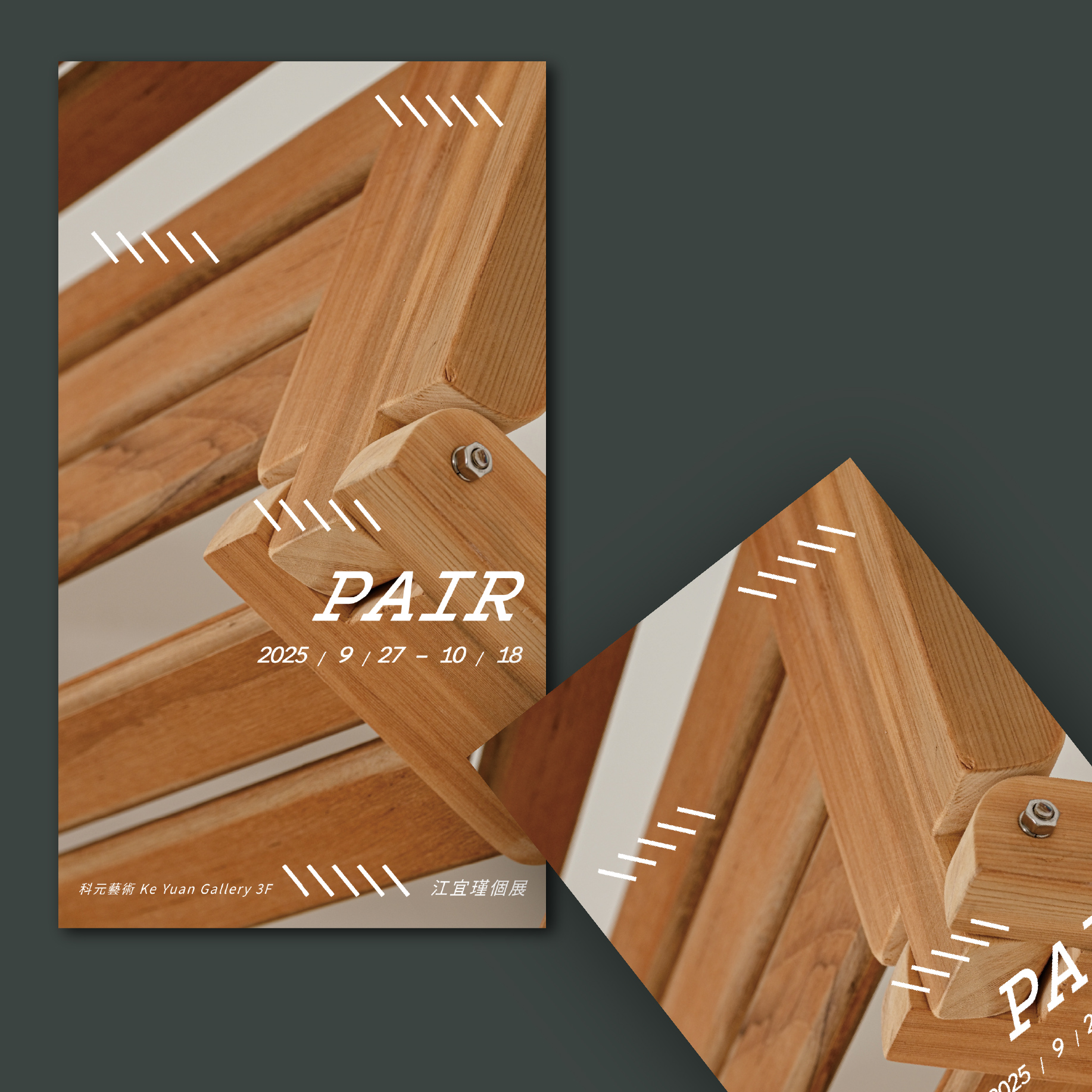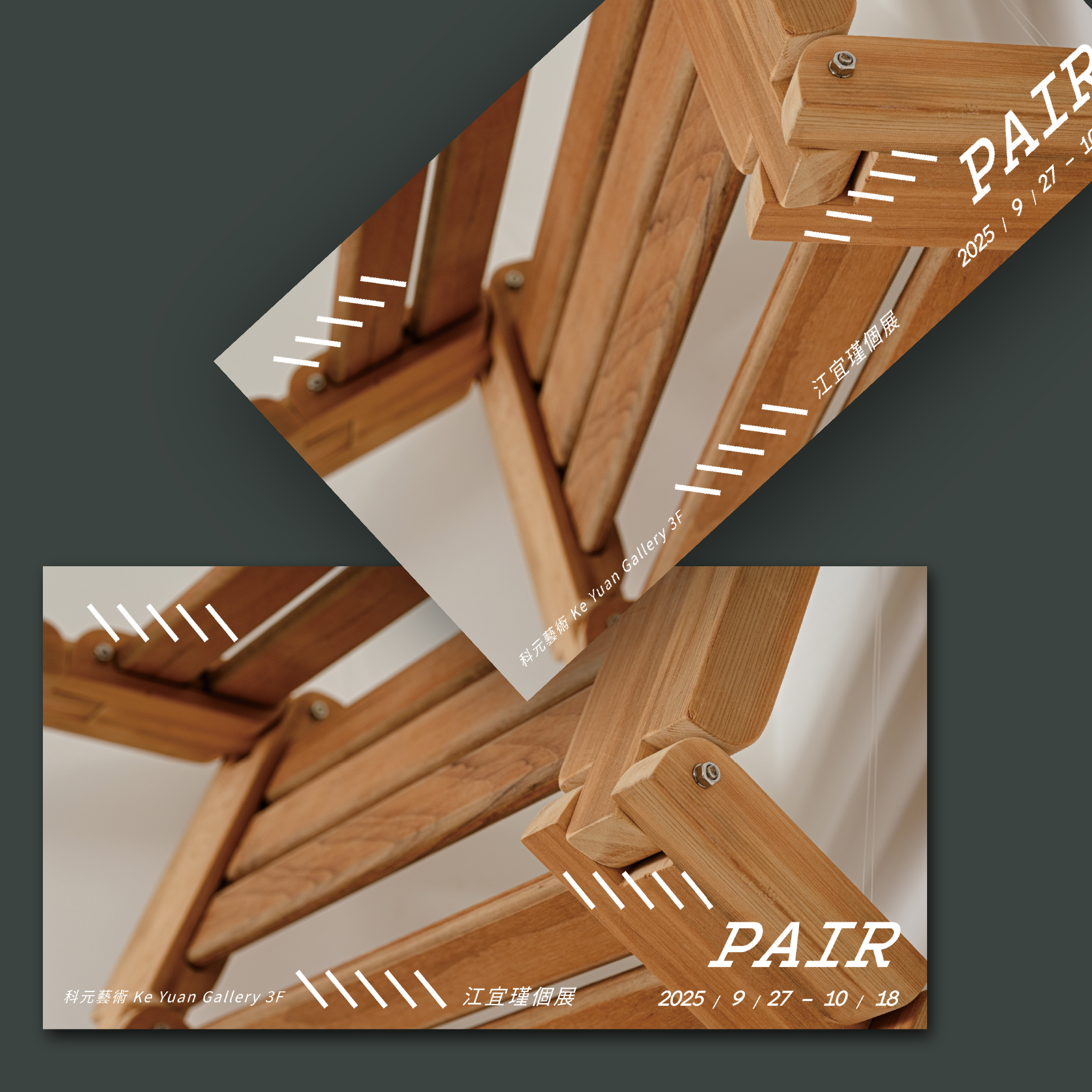 引用展覽概述:「展覽名稱《Pair》透過將物件的並置,聚焦於「關係的生成」,呈現物件與物件、材質與空間、感知與記憶之間的依存與對立。相較於過去以身體經驗為核心的創作,此次更進一步擴及空間,將私密回憶與身體感受交織,營造出具張力的觀看經驗。她透過卡榫、鑲嵌與球型關節等結構,使得物件撇除原有功能性外,在靜止的外表下仍隱含細微的動態敘事。」